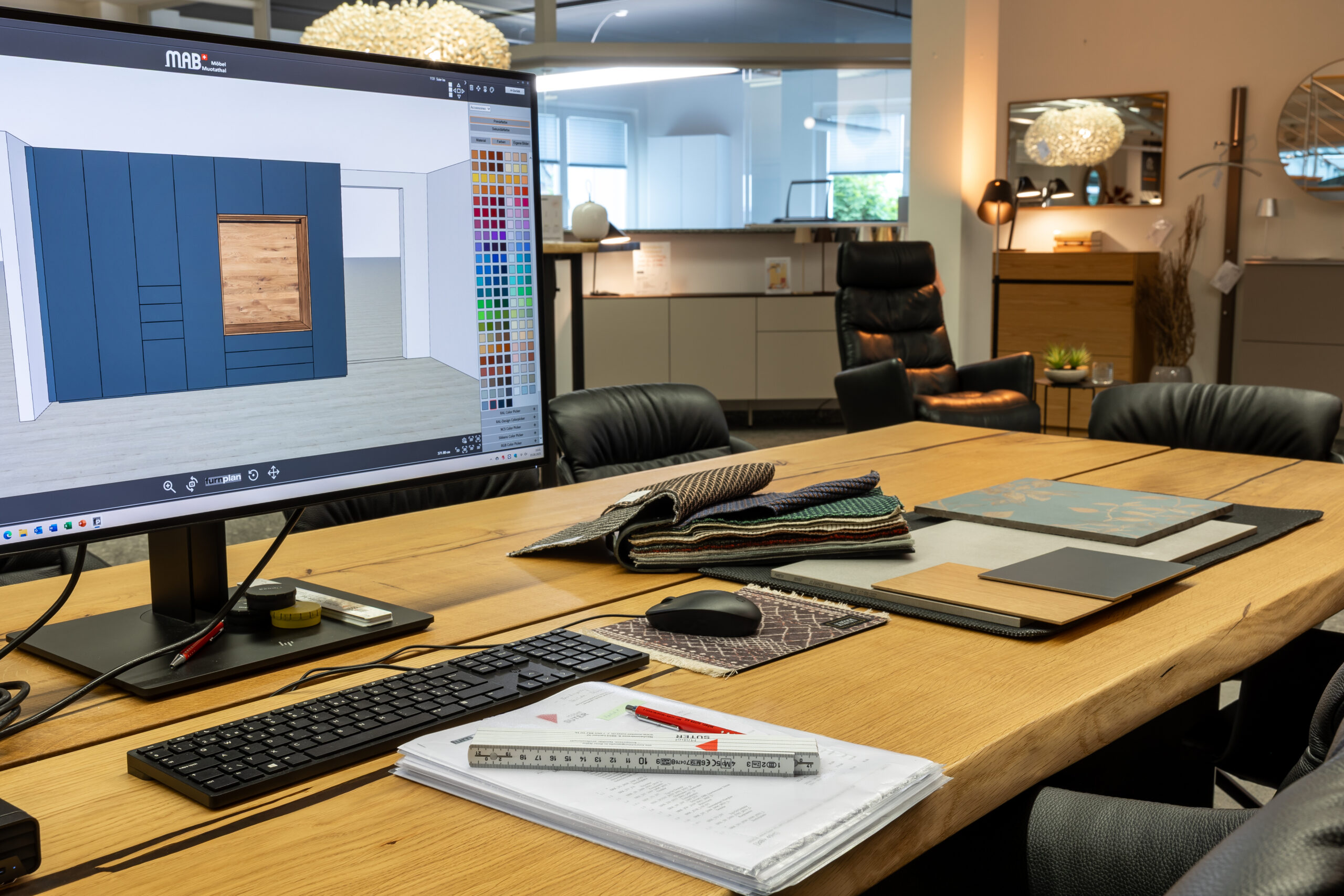 Im Showroom in Lachen erstellen wir individuelle Konzepte für Ihren Wohntraum. Mit den Programmen von furnplan und pCon können die Möbel geplant und an Ihre Wohnsituation angepasst werden.